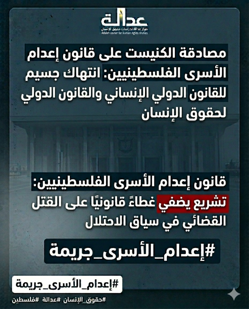 يدين مركز عدالة لدراسات حقوق الإنسان بأشد العبارات مصادقة الكنيست الإسرائيلي بتاريخ 30 آذار/مارس 2026 على قانون يفرض عقوبة الإعدام على الفلسطينيين المدانين أمام المحاكم العسكرية الإسرائيلية في قضايا تُصنَّف بوصفها “هجمات قاتلة”، في تشريع أُقرّ بأغلبية 62 صوتًا مقابل 48، ويقضي بجعل الإعدام شنقًا العقوبة الافتراضية، مع تقليص الضمانات القضائية وتسريع التنفيذ خلال 90 يومًا.
