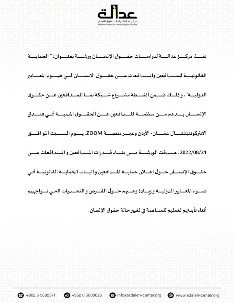 The Adaleh Center for Human Rights Studies was established in 2003 by Jordanian human rights activists as a non-governmental, non-profit organization that operates with political neutrality and seeks to promote human rights values in Jordan and the Arab world.