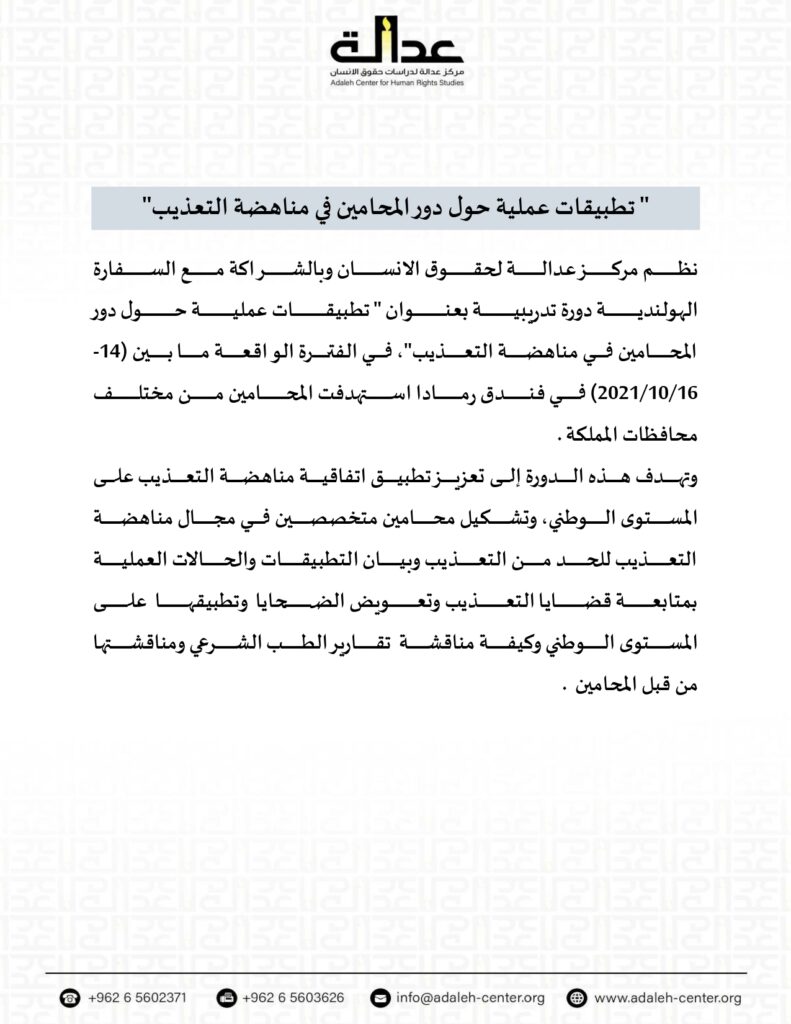 The Adaleh Center for Human Rights Studies was established in 2003 by Jordanian human rights activists as a non-governmental, non-profit organization that operates with political neutrality and seeks to promote human rights values in Jordan and the Arab world.